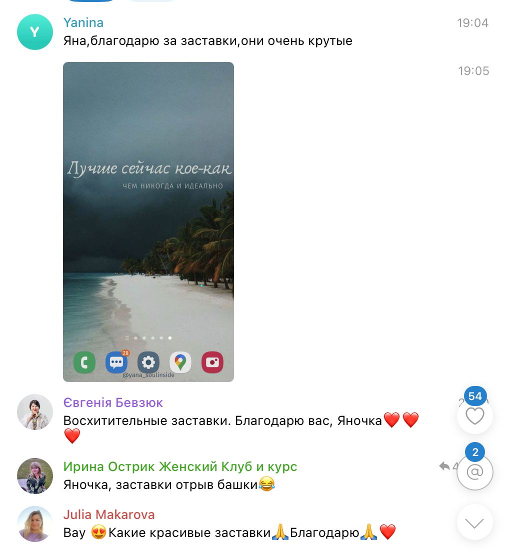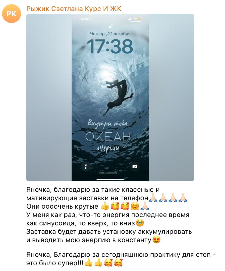 Уже более 100 человек стали счастливыми владелицами индивидуальных заставок и каждый день благодаря картинке устанавливают крепкую связь со своим Высшим Я, возвращают себя в момент, напоминают о главном и важном.