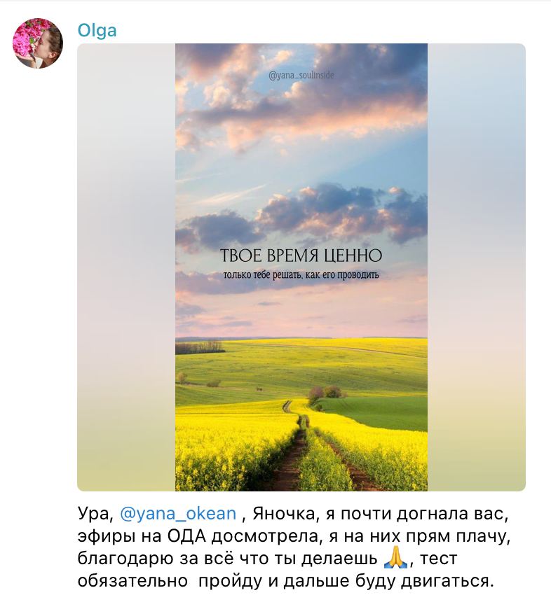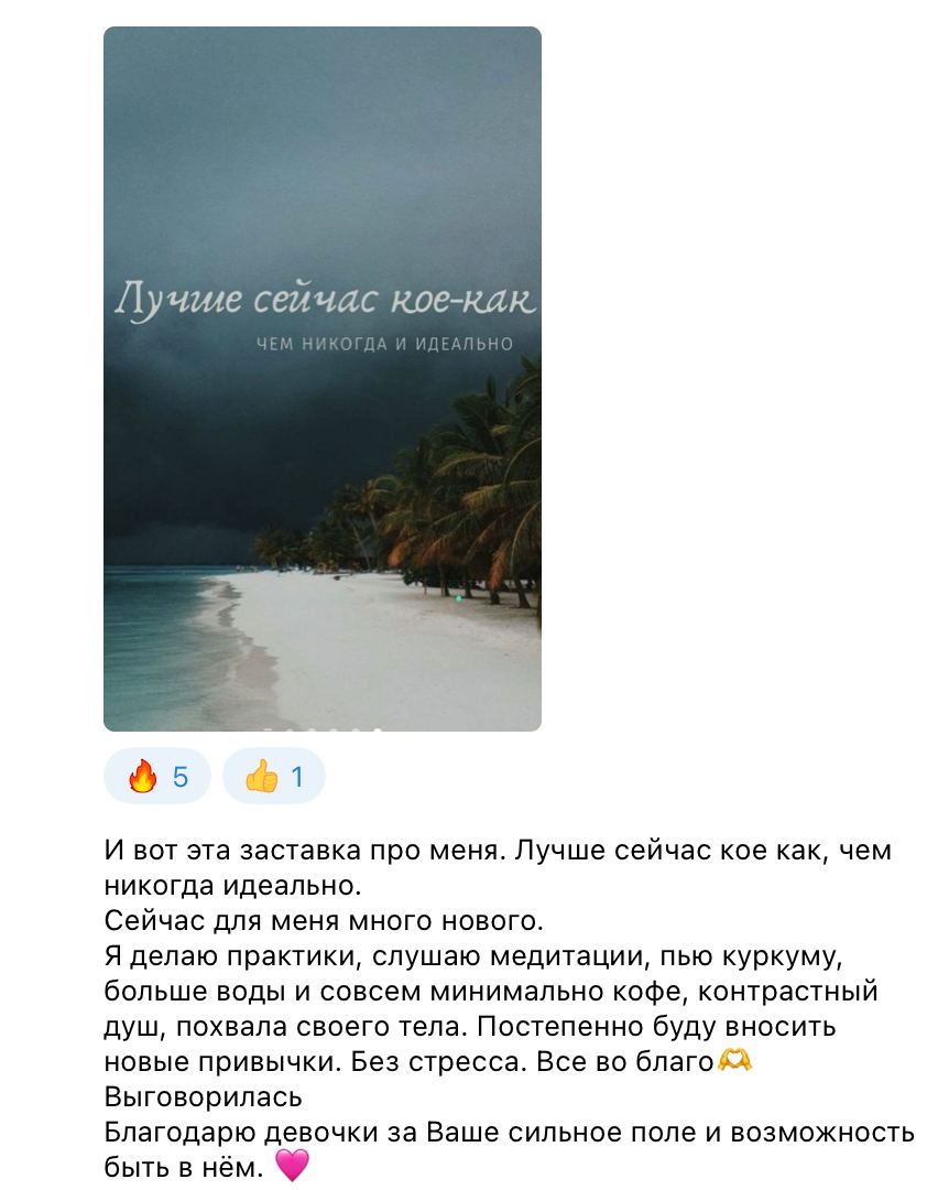 Яночка, девочки, приветствую вас! Януся, благодарю тебя за ту любовь, заботу и знания, которыми ты делишься Благодарю вас, девочки, за чудесное и поддерживающее пространство. Со мной происходят чудесные изменения. И самое важное - изменилось мое внутреннее состояние и самоощущение. Во мне поселились любовь, радость, легкость, спокойствие и умиротворение и это распространяется на мою семью и мои отношения с окружающими. Я с удовольствием делаю практики, изменила подход к питанию, 11 и 26 провела на воде и мне очень нравится все глубже и глубже познавать себя, менять свои привычки, развивать свое тело и учиться слышать себя и свою интуицию. И это все благодаря вам! Отправляю вам лучики своей любви Благодарю, благодарю, благодарю
